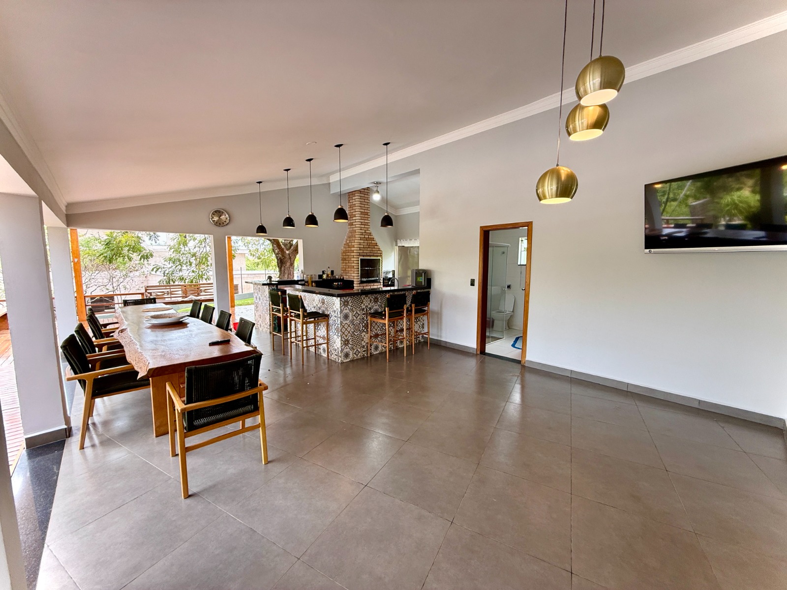 • Área gourmet com móveis planejados, churrasqueira e banheiro social